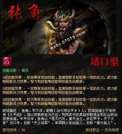 是個(gè)令人頭疼的武將,如果給張角帶重兵,其武技驅(qū)兵令人皺眉,效果令人汗顏。但是,合理的利用張角,也可以很爽。給張角帶上10個(gè)弓箭,帶滿糧食,混在隊(duì)伍里撿便宜。這廝時(shí)不時(shí)會(huì)出武技,驅(qū)走敵人幾百兵。給張角帶10兵,是遇到敵人1兵炮灰時(shí),可以滅掉。總的來說,張角不堪大用,適合帶幾個(gè)2級(jí)弓或4級(jí)戰(zhàn)車,切記不要帶3級(jí)弓。陣亡時(shí)沒什么損失,萬一發(fā)威,就有意外驚喜。張角是超級(jí)炮灰,炮灰中的戰(zhàn)斗機(jī)。。