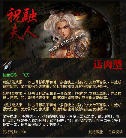 祝融夫人飛刀技能:技能效果攻擊目標(biāo)敵軍和他一條直線上2格內(nèi)的1支敵軍部隊(duì),并造成較大傷害。武力影響傷害效果,堅(jiān)韌和技能等級(jí)影響技能發(fā)動(dòng)概率。雖說祝融夫人攻擊力還可以接受,但是,切記不要給她帶3級(jí)弓,否則,她常常跑到最前面傻傻的站著等情哥哥,看風(fēng)景,談風(fēng)月,吟詩賦對(duì),打情罵俏,打醬油,打秋風(fēng)……什么都干,就是偷懶不肯攻擊,變成“送肉夫人”。武將太多時(shí),可以考慮解雇掉。