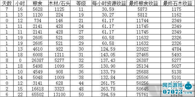4 每10級一檔,10-19級為每小時30糧食;20-29為61;30-39為132;40-49為262;50級為400。