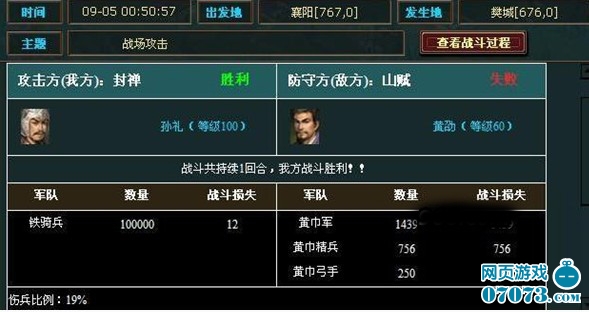 看戰(zhàn)報(bào)!5級(jí)黃巾城刷9個(gè)城市過(guò)完關(guān)!從襄陽(yáng)--樊城--西鄂精山--武平--倉(cāng)亭--東郡--下曲陽(yáng)--巨鹿--廣宗。半個(gè)小時(shí)就搞定,截取第一次戰(zhàn)役和最后戰(zhàn)役的戰(zhàn)報(bào),10W鐵騎最后剩余99218-28=99190、陣亡將士810,陣亡率0.8%.