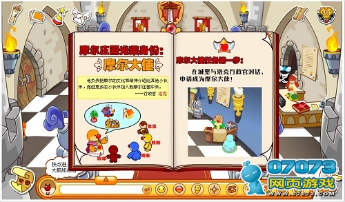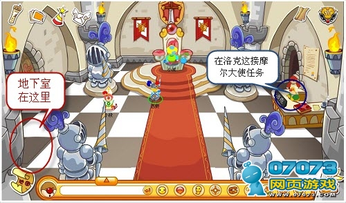 摩爾大廳:點(diǎn)擊中央寶座上方的劍,可以查看摩爾歷史。點(diǎn)擊洛克旁邊的書(shū)籍,可以閱讀摩爾大使手冊(cè),點(diǎn)擊洛克,還可以接到成為摩爾大使的任務(wù)。摩爾大廳和摩爾地下室、城堡二樓相連。