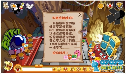 夾娃娃機是女孩子們最喜歡的游戲機了。投入一定的硬幣,就可以操縱游戲機,依靠技巧和反應,用小鉗子夾取機器中漂亮的娃娃(果然對小女生,娃娃有著極強的殺傷力)。依靠娃娃們卡哇伊的形象,夾娃娃機吸引了不少女孩子的注意呢。如今,《摩爾莊園》提供給了女孩子們一個玩游戲的機會哦,快快快,跟著西野哥哥一起玩吧。