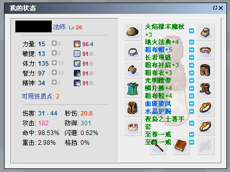 根據(jù)我上一篇帖子的傷害輸出最優(yōu)化原則,應(yīng)該是HP和SP同時(shí)消耗殆盡,一起恢復(fù),不浪費(fèi)任何一個(gè)屬性。而法師的裝備多是增加智力,體力加的較少,這就需要在資質(zhì)點(diǎn)的分配上下點(diǎn)功夫了。極端的做法肯定是行不通的,至少對(duì)于SOLO法師來講。 所以為了配合我大腦智力的發(fā)育,一定的生理強(qiáng)化也是必須的。下面是幾件我注魔體力的裝備: 火焰橡木魔杖+3 粗布襯肩+3 就是這些裝備,讓我的HP上限增加到1600+, 完全可以勝任20級(jí)以前的solo工作。 最終體現(xiàn)在實(shí)際測(cè)試中是,19級(jí)時(shí),farm 17-18級(jí)的怪物,可以一次打完一整格的怪物再休息。 ----------