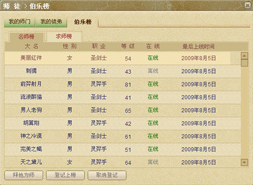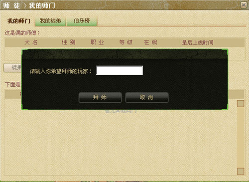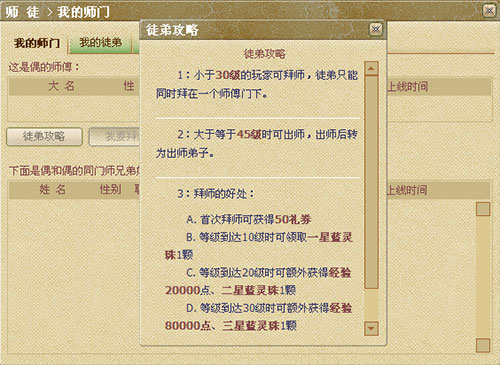 玩家了解拜師向?qū)?br />   在師徒系統(tǒng)中,作為師傅的一方等級需要在40或40級以上,而徒弟一方的等級需要在30或30級以下,這是建立師徒關(guān)系的基本條件!通過師徒界面點(diǎn)擊“我要拜師”并輸入要拜師的對象,行過拜師儀式之后,師徒關(guān)系就正式建立了。一個(gè)玩家可以同時(shí)收5個(gè)徒弟。如果想再多收,必須要等以前收的徒弟出師了就可以了。徒弟出師的等級為45級,在這段期間,師徒二人可以結(jié)伴而行,在《幻境2》的世界里樂得逍遙。