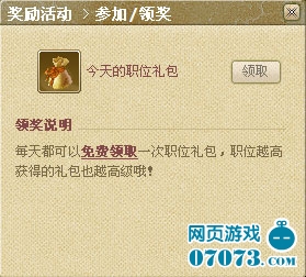 只要每天登錄游戲,哪怕什么都不做,都能收到系統(tǒng)提供的每日登錄禮包,并且隨著在游戲中職位的提升,禮包獎(jiǎng)勵(lì)的內(nèi)容也會(huì)發(fā)生變化。并且,在每周的每一天,都有豐富的界面活動(dòng)等你來(lái)玩,只要參加了就有獎(jiǎng)勵(lì)。