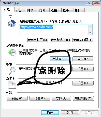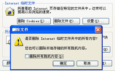 依次單擊IE菜單欄中的“工具”→“Internet選項(xiàng)”,打開“Internet選項(xiàng)”對(duì)話框,在“常規(guī)”標(biāo)簽中點(diǎn)擊“刪除文件”按鈕,在彈出的“刪除文件”窗口中勾選“刪除所有脫機(jī)內(nèi)容”,最后點(diǎn)擊“確定”。