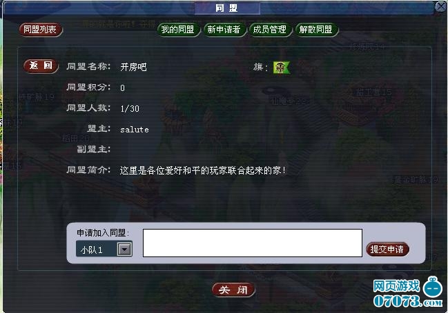 然后就進入同盟界面了。這個界面有兩個菜單,一個是查看已有同盟,你可以選擇自己喜歡的同盟加入。還有一個就是建立同盟了。