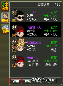 1、在右側(cè)雇員面板中選擇一個(gè)武將,點(diǎn)擊“詳細(xì)”按鈕