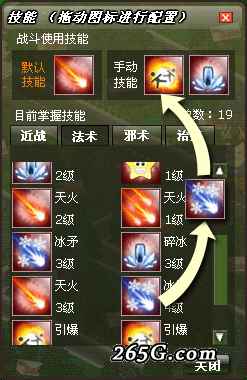 3、將希望在戰(zhàn)斗中使用的技能拖到上方的“戰(zhàn)斗使用技能欄”上,最多可配置1種默認(rèn)技能和1種手動(dòng)技能。