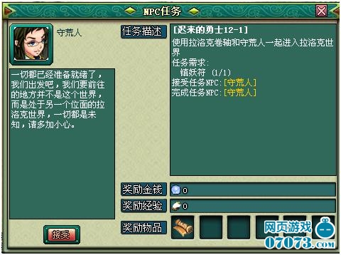 副本任務的第一步是在守荒人那里接的叫遲來的勇士(真的很遲,都過了很多年了,留意支線劇情的朋友應該知道我說的是什么意思--)。