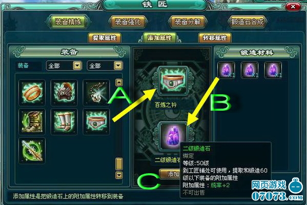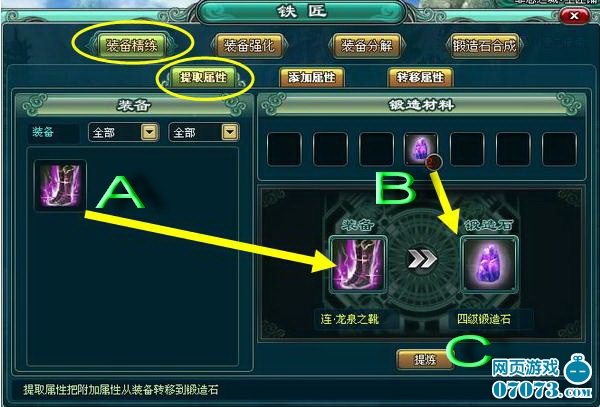按照小編的提示:A、點擊想要提取屬性的目標裝備;B、選擇相應(yīng)等級的鍛造石;C、點擊“提煉”就可以把裝備上的附加屬性提取到鍛造石中了。其中只有40級以上的至少藍色的裝備才能參與“屬性提取”,40級的裝備必須對應(yīng)一級的鍛造石,50級的裝備對應(yīng)二級鍛造石,如此類推。(注意:一旦提煉成功,裝備就會消失哦。)