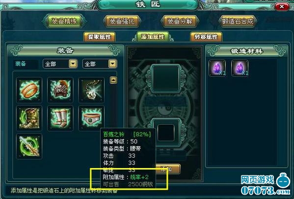 進入4399盤龍神墓記下一個“添加屬性”界面,只要按上圖提示把相應(yīng)的裝備和帶有附加屬性的鍛造石點擊添加,附加效果就會成功附加到對應(yīng)的裝備上。細心的玩家們只要把鼠標移動到鍛造石中,就會出現(xiàn)鍛造石的相應(yīng)信息,信息中顯示的是目標裝備的鍛造要求。其原理與“提取屬性”的等級要求一致。操作完成后就可以得到下圖的成品了。