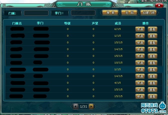 小G我玩游戲就希望能夠加入排名前十的門派,不過(guò)門派系統(tǒng)還真讓小G我頭痛,點(diǎn)擊門派彈出了下面的界面,但是很遺憾,沒(méi)有按照排名來(lái)顯示。如果是按照排名來(lái)顯示的話,我們就能夠一目了然的看到想加入的門派了。