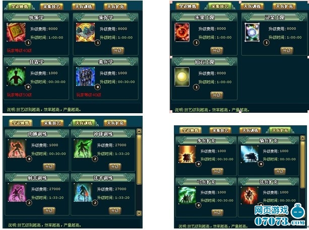 提升建筑的基本作用是技藝級別越高,效率越高,產(chǎn)量上限也會更高。在功能表上點(diǎn)擊『玄界』,有一個『技藝』按鈕,點(diǎn)擊進(jìn)去可以發(fā)現(xiàn)如圖(1)所示,建筑可以分為四大類:1.學(xué)識修煉 2.采集技藝 3.天兵訓(xùn)練 4.天兵擴(kuò)充。其每一類技藝都有不同,如圖(2)可以看到升級是需要玩家等級、費(fèi)用條件與時間符合。如下