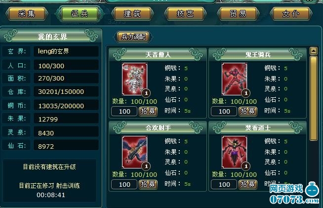 1.在功能菜單中點(diǎn)擊“征兵”,即可進(jìn)入『征兵』界面,點(diǎn)擊相應(yīng)兵種的“征兵”按鈕,就可以招募到不同的兵種:天音僧人、鬼王騎兵、合歡射手、焚香道士、青云劍修。