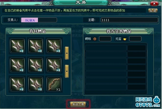 輸入正確的交易人名稱以及主題,并放上相應(yīng)的物品即可開始交易。