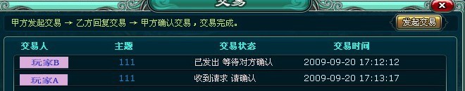 a 當(dāng)玩家A發(fā)出交易給玩家B時(shí),玩家A在交易窗口都可以看到交易狀態(tài)“已發(fā)出 等待對方確認(rèn)”,同時(shí)玩家B的收到玩家A的交易邀請,“交易”功能也會自動閃動,如圖(4)。玩家B打開交易主題,就可以看到對方與自己交易的詳細(xì)信息,然后按”回復(fù)交易”,如圖(5)。玩家A看到覺得交易內(nèi)容無誤,就可以“確定”交易。交易成功!如圖(6)