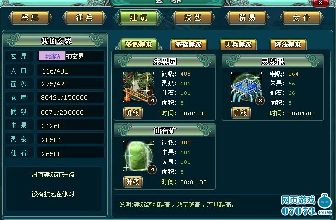 資源倉庫:用來存放朱果、靈泉與仙石,升級(jí)可以擴(kuò)大物質(zhì)的儲(chǔ)存上限。