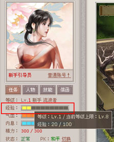 你可以通過打怪和做任務獲取經(jīng)驗來提升人物等級,隨著等級的提升你的人物能力也會隨之增強。你可以在頁面左邊人物面板里的黃色經(jīng)驗槽中看到當前經(jīng)驗值和升級所需的經(jīng)驗值。如下圖: