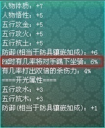 例:小明使用了1張屬性鎖定卡,將自己護身符的“PK時有幾率將對方踢下坐騎:6%”屬性進行鎖定,鎖定成功后,小明再次洗煉護身符時,被鎖定的這條屬性將不會變化,另外7條未鎖定的屬性會隨機變化。