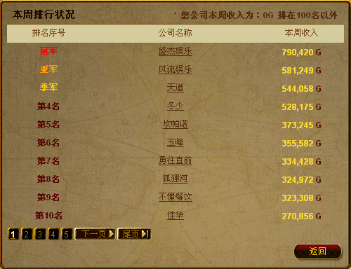 從5月14日新服”雷霆萬鈞“開啟后至5月21日11時,收入最多的前10家公司將獲得相應的資金獎勵,前三名分別獲得1000、600、400金幣,后7名玩家均可得到200金幣。