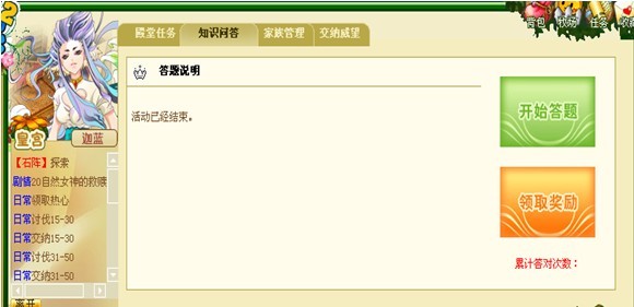 活動(dòng)內(nèi)容:活動(dòng)開(kāi)啟后,皇宮會(huì)開(kāi)放“知識(shí)問(wèn)答”活動(dòng)。玩家回答完題目后會(huì)獲得大量經(jīng)驗(yàn)和物品獎(jiǎng)勵(lì),每個(gè)賬號(hào),每天限答一輪。