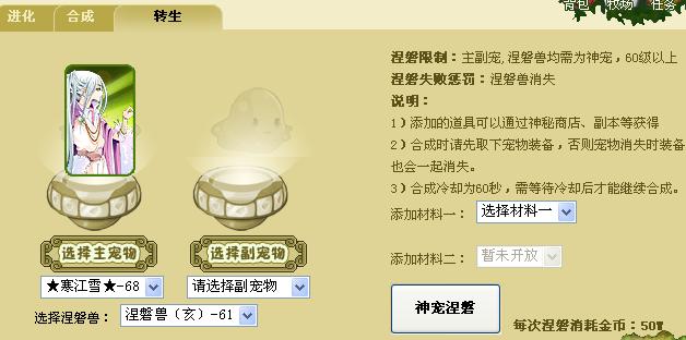 進入轉(zhuǎn)生頁面后,我們可以選擇要轉(zhuǎn)生的寵物放在主寵物欄,選好副寵物與涅磐獸后,就開始轉(zhuǎn)生吧~當(dāng)然也不是所有寵物都能拿來轉(zhuǎn)生的,對于不能進行轉(zhuǎn)生的寵物在轉(zhuǎn)生時是會給予提示的。