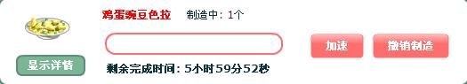 2、加速所需金錢:很貴,制造1個(gè)雞蛋豌豆色拉收入是300金幣,扣去成本金錢利潤(rùn)是:300-261=39金幣,但是加速1個(gè)雞蛋豌豆色拉卻需要360金幣(注意:是1個(gè),如果2個(gè)則720金幣),如果加速則嚴(yán)重虧損;有些食物的加速制造更是需要不少酷幣,比如要加速制造1個(gè)芒果刨冰,則需要18酷幣