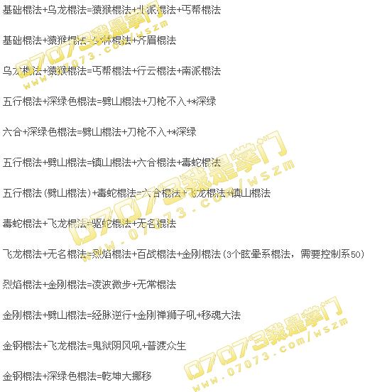 繼續(xù)往下說,五行棍法或者六合棍法加上隨便一個深綠棍法,能合出來劈山棍法。再用劈山棍法和五行棍法(六合棍法)就能合出鎮(zhèn)山棍法+六合棍法+毒蛇棍法了。