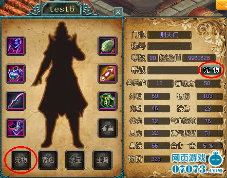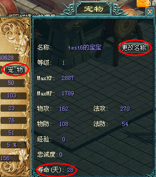 按C鍵,打開人物屬性裝備界面,在裝備欄中,有一格是為寵物準備的,如下圖所示。鼠標右鍵點擊背包里的寵物,就會裝備上寵物。只有當寵物裝備上時,才可以點擊“寵物”按鈕,打開寵物面板,修改寵物的名稱。寵物都具備壽命,您可以將鼠標移動至召喚石上,即可見寵物剩余的生命,該屬性也可以在寵物面板中查看。