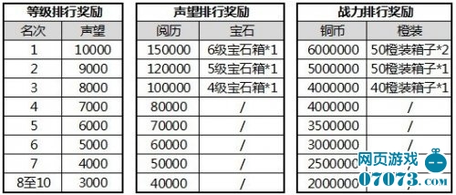 開(kāi)服后至9月30日23點(diǎn)(刷新會(huì)有延遲,實(shí)際請(qǐng)以10月1號(hào)23:00數(shù)據(jù)為準(zhǔn)),游戲內(nèi)將根據(jù)所有人的等級(jí)、戰(zhàn)力、聲望進(jìn)行排行,各榜排行前十者將獲得豐厚獎(jiǎng)勵(lì)。