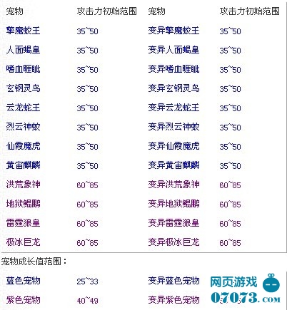 寵物攻擊力初始范圍(0級(jí)寵物,寵物在得到時(shí)為1級(jí),是在下面數(shù)值基礎(chǔ)上計(jì)算一次成長(zhǎng)值的加成):