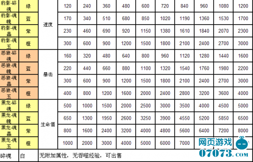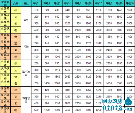 不同品質(zhì)武魂升級(jí)所需要得經(jīng)驗(yàn)值如下表: