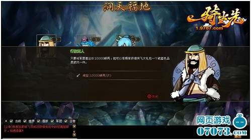 洞天福地出擊 玩轉(zhuǎn)奇遇奪珍寶 洞天福地是《一騎當(dāng)先》封地系統(tǒng)新增的一大奪寶玩法,玩家每日進(jìn)入洞天福地探險(xiǎn),會(huì)遇到隨機(jī)出現(xiàn)的幾個(gè)特殊NPC,比如:土地公、乞丐等,點(diǎn)擊與他們對(duì)話即可觸發(fā)不同的事件,得到不同的收益,如銀幣、裝備、突飛令、體力包、軍功等。這是一個(gè)充滿驚喜與奇遇的仙境之地,在洞天福地中一切盡有可能,只等你來探索!