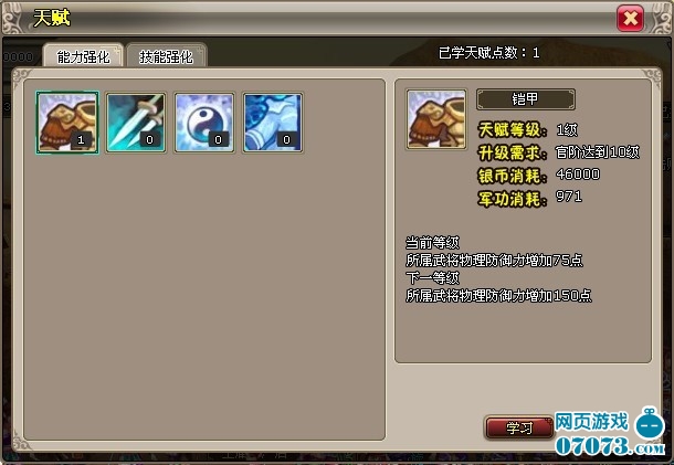 點(diǎn)擊“天賦”按鈕后,看到當(dāng)前主將可以學(xué)習(xí)的天賦,如下圖: