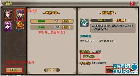 鍛造界面里包含有武將、武將裝備、強(qiáng)化概率、強(qiáng)化按鈕、打開(kāi)包裹、未裝備。玩家可以很方便選擇武將來(lái)為武將身上佩戴的裝備進(jìn)行強(qiáng)化,十分人性化的設(shè)置。