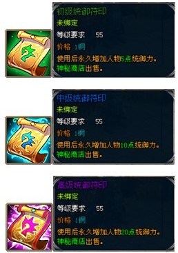 統(tǒng)御符印分為初級(jí)、中級(jí)、高級(jí)3種類型,級(jí)別越高的統(tǒng)御符印可增加的統(tǒng)御力點(diǎn)越多。