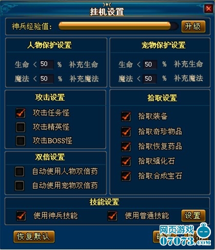 在掛機(jī)設(shè)置界面中可以手動升級神兵等級(經(jīng)驗值滿足條件),如果神兵經(jīng)驗值不滿足升級條件則升級按鈕標(biāo)灰;