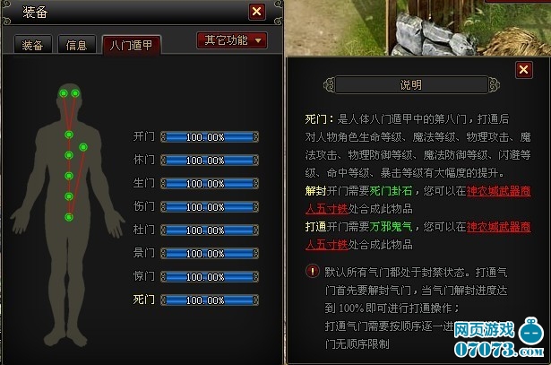 在這里,不得不再提及一次八門遁甲這個系統(tǒng)。它可以說是最快速而且簡便的提升自身屬性方法,“開”“沖”“封”只需沖破自身的8個靜脈,其本身所有對應的屬性多可以得到大幅度加強。暴擊,物理攻擊,魔法攻擊等你所追求的屬性加層,都可以在此得到最直接的實現(xiàn),讓你獲得最大程度的滿足感。打開界面下方的【人物】就可以具體的查看到八門系統(tǒng)的詳情介紹咯~