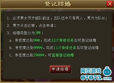 b、親密度達(dá)到9999,完成11次奇緣任務(wù)后可登記結(jié)婚。