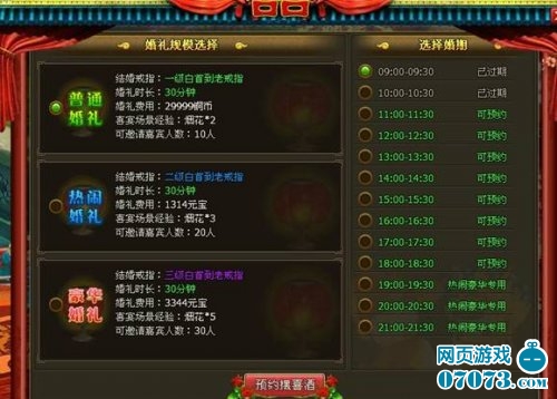 登記結(jié)婚完成愛(ài)情考驗(yàn)后,就可以預(yù)約婚禮了婚禮有三種,分別是:普通、熱鬧、豪華,具體見(jiàn)下圖: