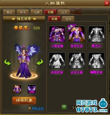 在圖中我們也可以看出,衣柜分為時裝和掛飾,不用多想了,掛飾就是翅膀。我們先看下界面的其他內(nèi)容,預(yù)覽效果不用說了,著裝度目前我也不是很了解,估計是和時裝有關(guān)吧。保存形象也非常明顯了,就是保存你要換的時裝。
