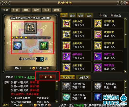 在甲瑪王城的裝備強化師處或者在游戲界面右下的“鑄造”,可以進行裝備升星。