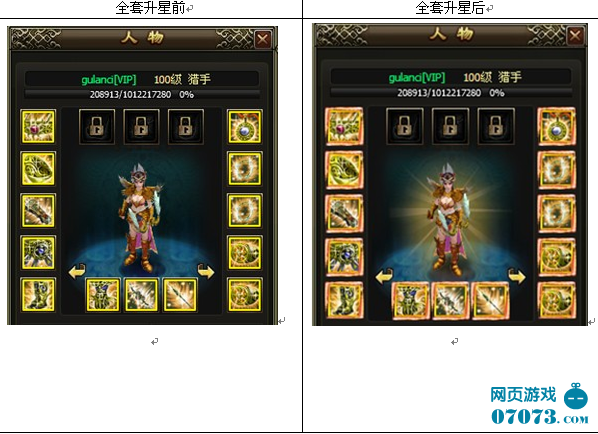 攻擊屬性從150升到(150+234=384),攻擊力足足提高了2.56倍,如果全身都是升星后的裝備,戰(zhàn)斗中將是何等的快意。