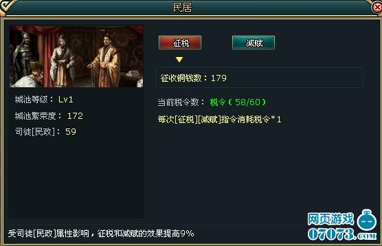初進(jìn)入游戲系統(tǒng)會默認(rèn)贈送50個稅令,開通vip可以增加稅令基礎(chǔ)數(shù)量。民居中減賦可以增加城池繁榮度,增稅可以獲得銅錢。這里建議新手玩家將繁榮度至少提升至10級,保證順利晉升爵位。10級繁榮度約消耗15個稅令。剩余稅令你可以根據(jù)情況自行分配。