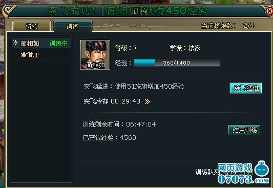 游戲中,武將是你實力的最好證明,諸子百家的武將升級模式不同于慣用的打怪升級,而是通過將領(lǐng)訓(xùn)練進(jìn)行提升的,不論在線和離線,只要武將處于訓(xùn)練狀態(tài),經(jīng)驗就會源源不斷。“突飛猛進(jìn)”能夠快速的獲得大量經(jīng)驗值,突飛需要消耗在戰(zhàn)斗過程中獲得的旌旗,且有冷卻時間,需要合理分配使用。