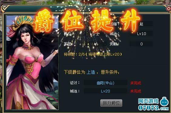 回主城,此時已經(jīng)可以提升爵位到公士啦。晉升爵位后同時可以提高攜帶的武將數(shù)量和將領(lǐng)的等級上限。